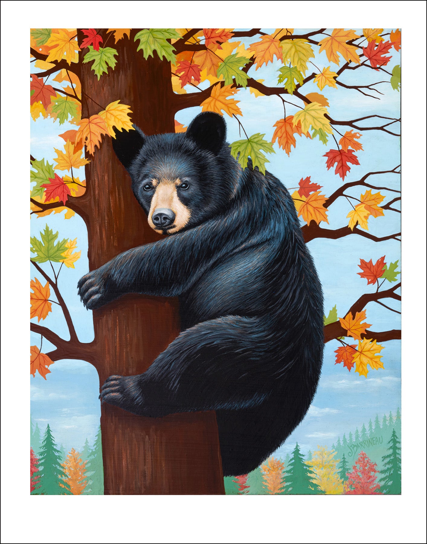 Fun fall colors surround cute black bear in a tree in this print from a painting by Jennifer Barrineau.